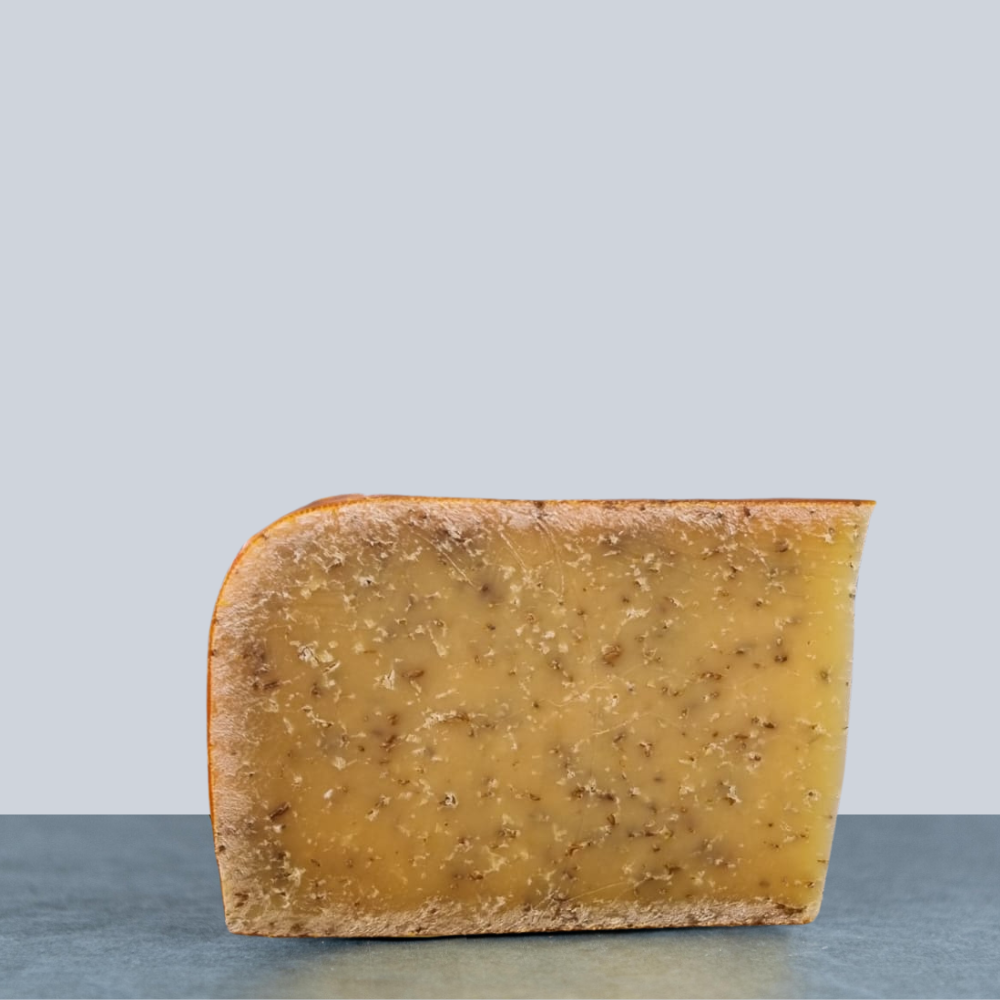 Our cumin-infused Gouda cheese has undergone natural maturation for a period of two years, resulting in a fuller texture and intensified flavor. The addition of cumin seeds further enhances the richness and depth of taste in this matured cheese.
